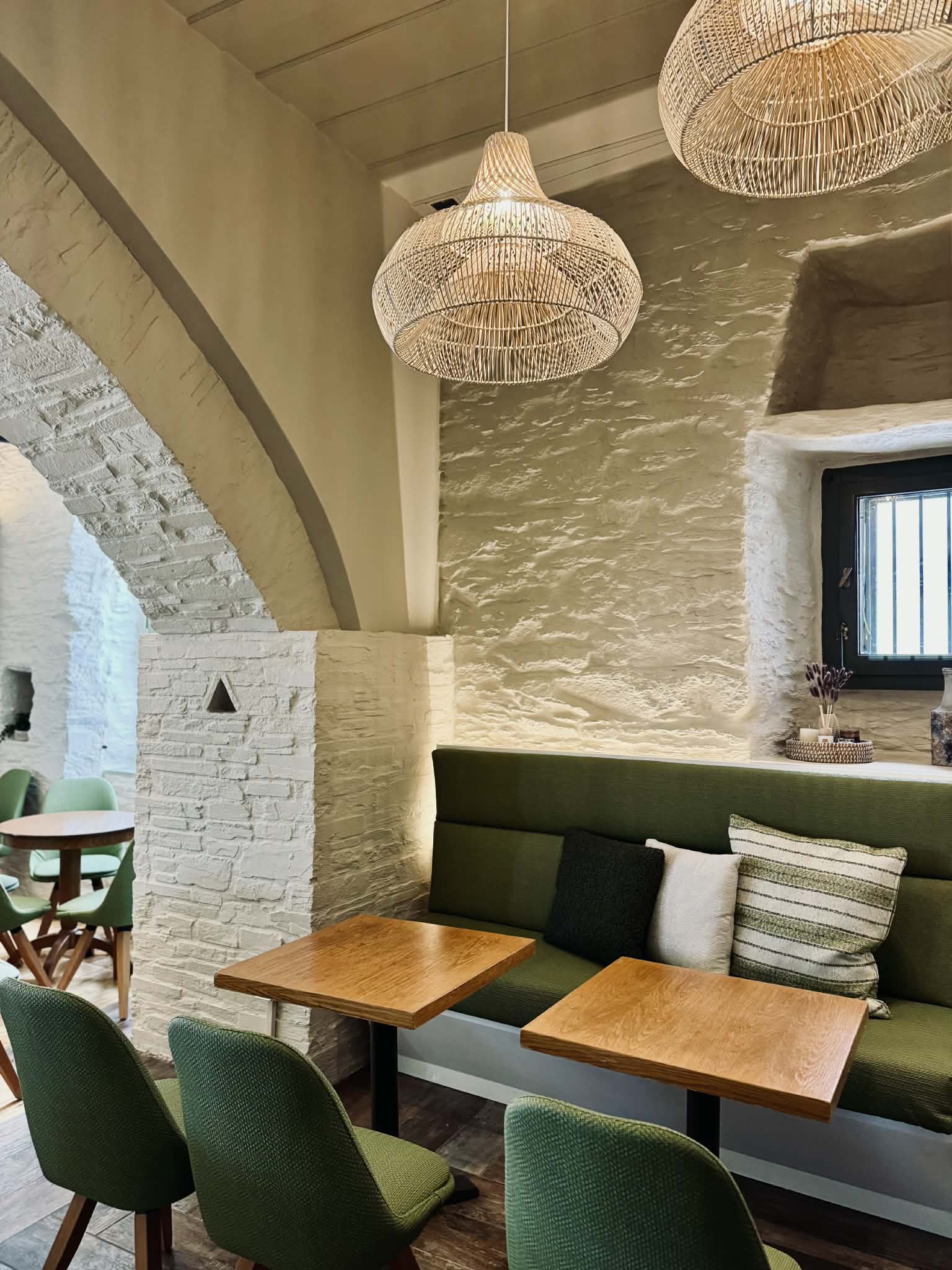 White stone, olive wood, natural light falling on the sea. See our space through photographs.
